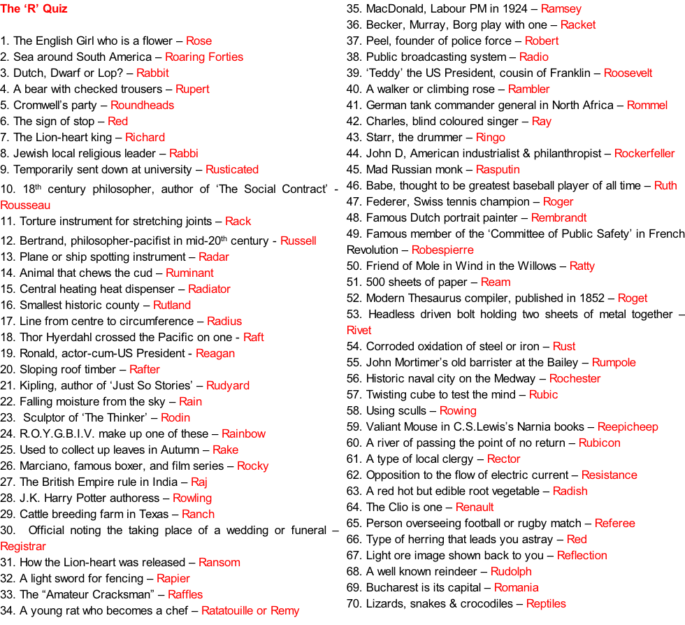 RDC News Make a point of visiting us weekly!        Tell a friend about us. Quiz No. 31   Find the ‘R’ Words - ANSWERS   A fun quiz that tests general knowledge and vocabulary. All the answers begin with the letter ‘R’ 	(To return to Quizzes Contents page CLICK HERE) Top of Page