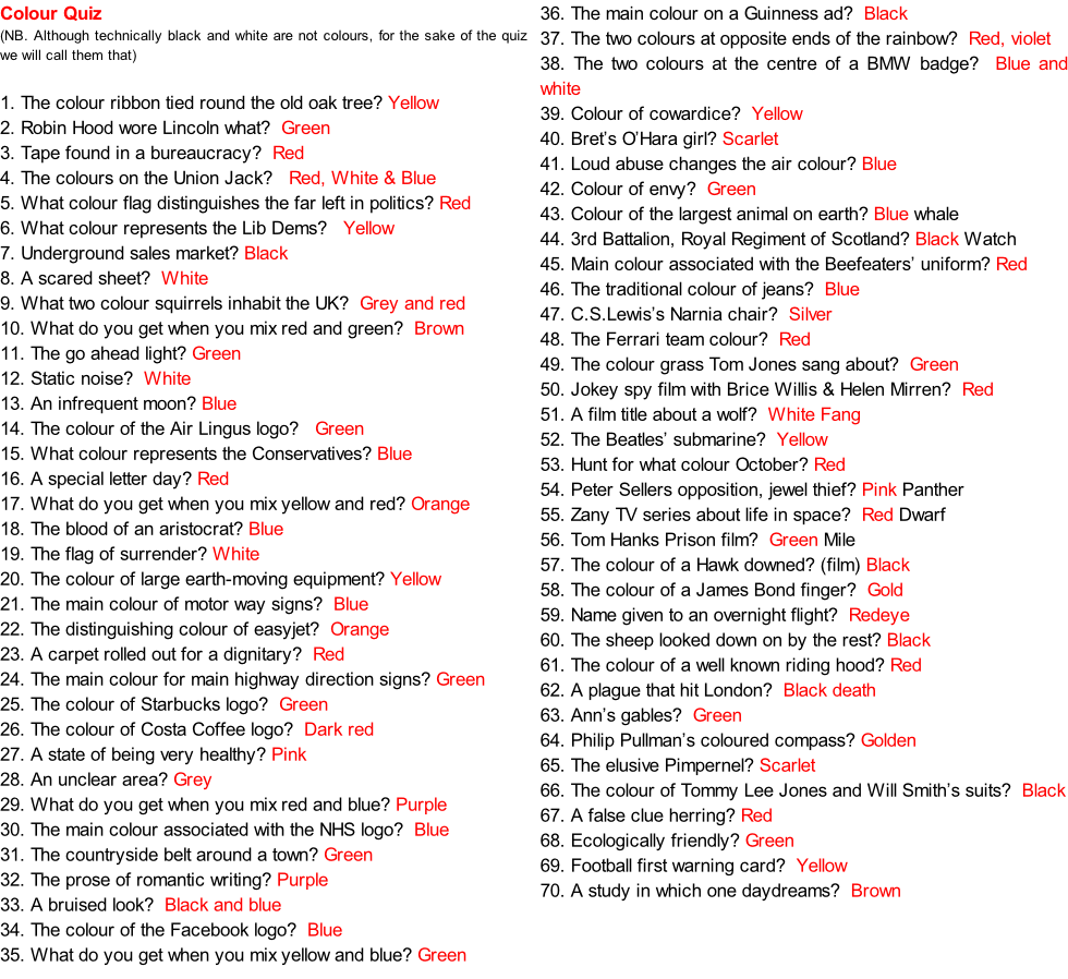 RDC News Make a point of visiting us weekly!        Tell a friend about us. Quiz No. 51  Colour Quiz - ANSWERS   Well, we hope you found it as easy as we hoped it would be 	(To return to Quizzes Contents page CLICK HERE) Top of Page