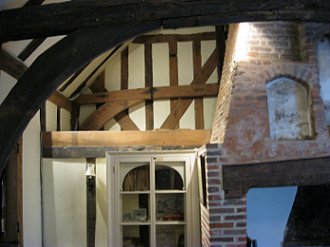 RDC News Make a point of visiting us weekly!        Tell a friend about us. Places of Interest “The Old House”, South Street, Rochford Right hand wall facing South Street, with exposed panels showing Wattle and Daub The large fireplace in front of which, set in the floor, are the remains of the original hearth. This chimney stretches up to the ceiling past the beams (see below) The view of the south wall of the old Hall, beyond the fireplace and chimney reminds us of the amazing amount of timber structure and in the foreground one of the main columns and beams To continue to next page, please CLICK HERE
