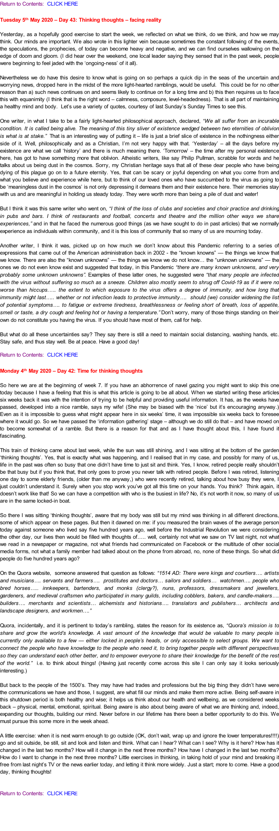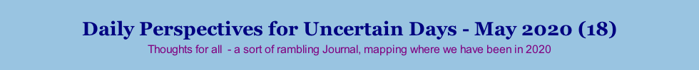 Make a point of visiting us weekly!        Tell a friend about us. Daily Perspectives for Uncertain Days - May 2020 (18) Thoughts for all  - a sort of rambling Journal, mapping where we have been in 2020