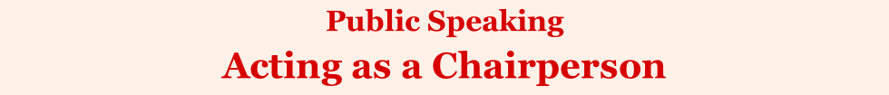 RDC News Make a point of visiting us weekly!        Tell a friend about us. Public Speaking  Acting as a Chairperson This Paper’s Contents:  1. Introduction 2. Introducing Others 3. Laying a Framework 4. Bringing to a Close 5. Recap & Conclusion   PAPER THREE : Acting as a Chairperson  1. Introduction Papers in this Series  1.	An Introduction to Giving a Speech 2.	The Simple Speech 3.	Acting as a Chairperson 4.	After Dinner Speeches 5.	Wedding Speeches 6.	Speaking at a Funeral  7.	Farewell Speeches 8.	Power Outages, Phones and Projectors